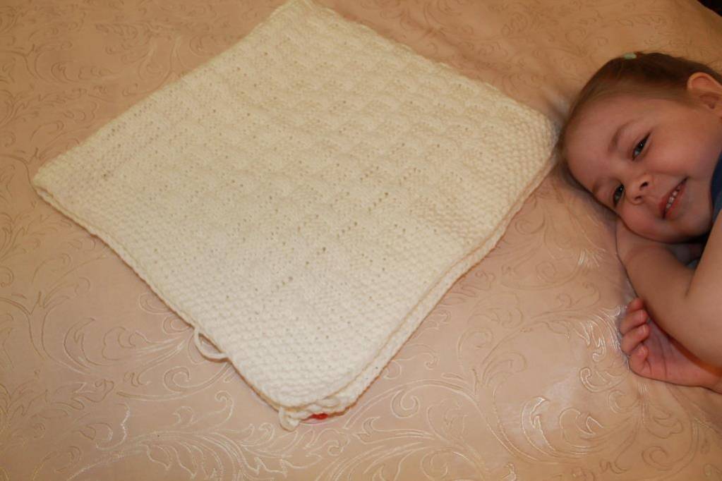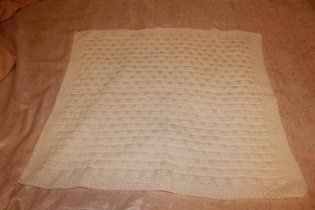 Пледик довязала. Правда, еще не украшала. Хочу ленточку по периметру вставить и бантик сделать. Еще не решила, каким цветом. Из имеющегося только ярко-зеленый, золотистый и темно-синий. Покупать не хочется, но и то, что есть, не очень нравится...
