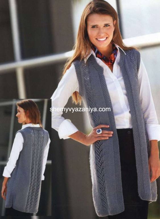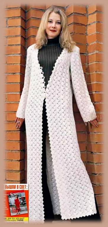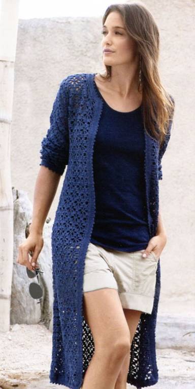 Если не трудно, киньте картинки женского кардигана спицами.Хочу длинный, несложный и красивый