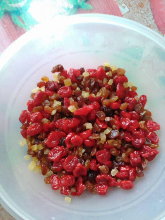 Я замочила в роме, вернее в том, что от него осталось...у меня вяленая вишня, изюм и сушеные кусочки ананасов. Миндаль порезала, сахар на пудру перетерла.