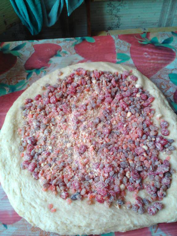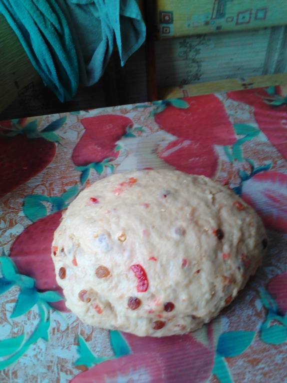 Вторая попытка более удачная, опара поднялась хорошо, тесто в шар выкатала и положила в теплое место на часок, цукаты, изюм, орехи смешала и присыпала мукой.