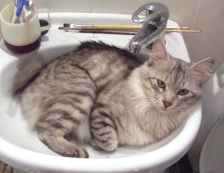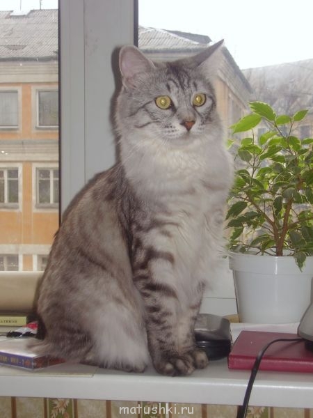 Чудесный! На выставках его можно было спокойно достать из клетки и он сколько угодно позировал, замечательно (не остервенело, а весело, по-доброму) играл с дразнилкой (палочка такая специальная) и с бантиком. Никогда не царапался и не фыркал даже, как бы его Артур не таскал. Ухаживал за котятами, даже под хвостом их вылизывал и в лоток таскал. Артуру в качалку тоже их как-то укладывать начал (даже фото есть) и не пришлось долго объяснять, что "нельзя!" - быстро сообразил. Добрейший котяра!Анатольевна:Котя-красавец, а какой характер?