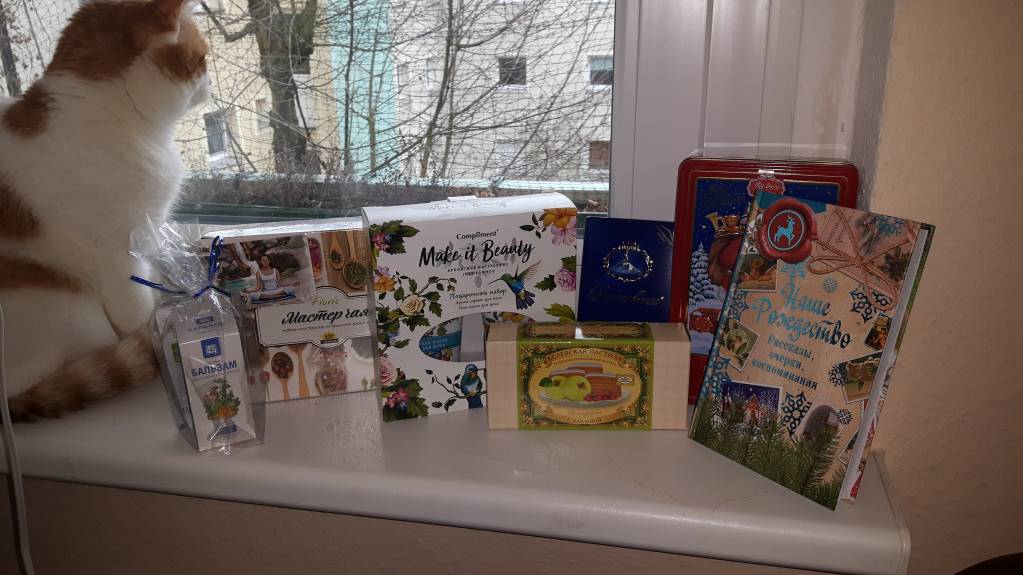 После Литургии поздравили меня многочисленными подарками, здесь и белевская пастила, и чай-конструктор из крымских трав, конфеты/шоколадки, и книга с памятной надписью от ребят. Так трогательно...