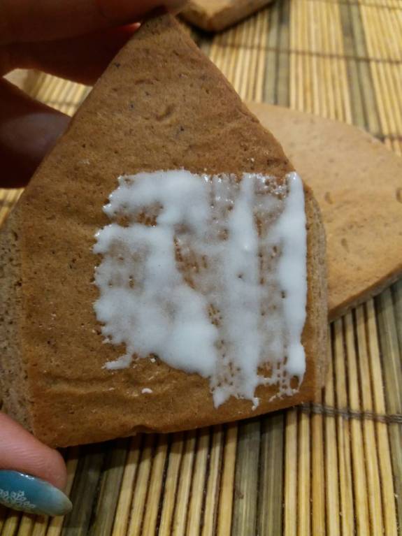 Немного откладываю айсинга в миску, пару капель воды и обычной кисточкой смазываю, периодически смачивая ее в воде