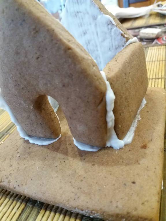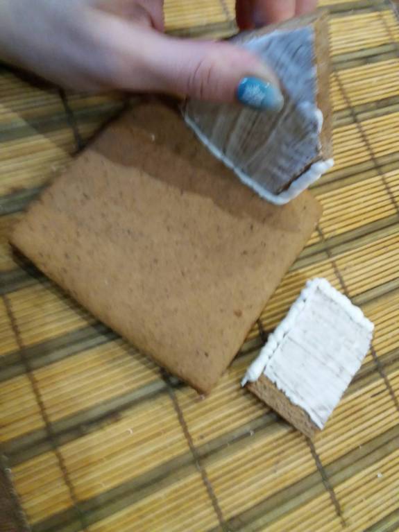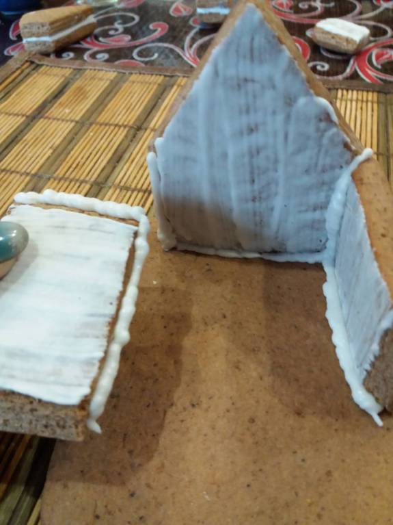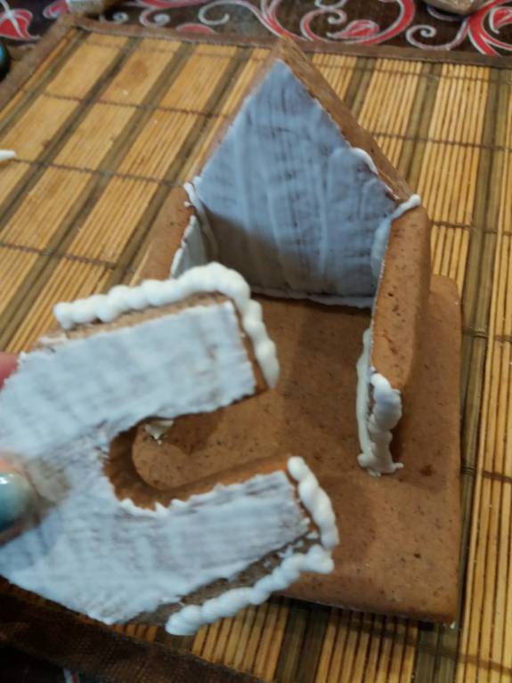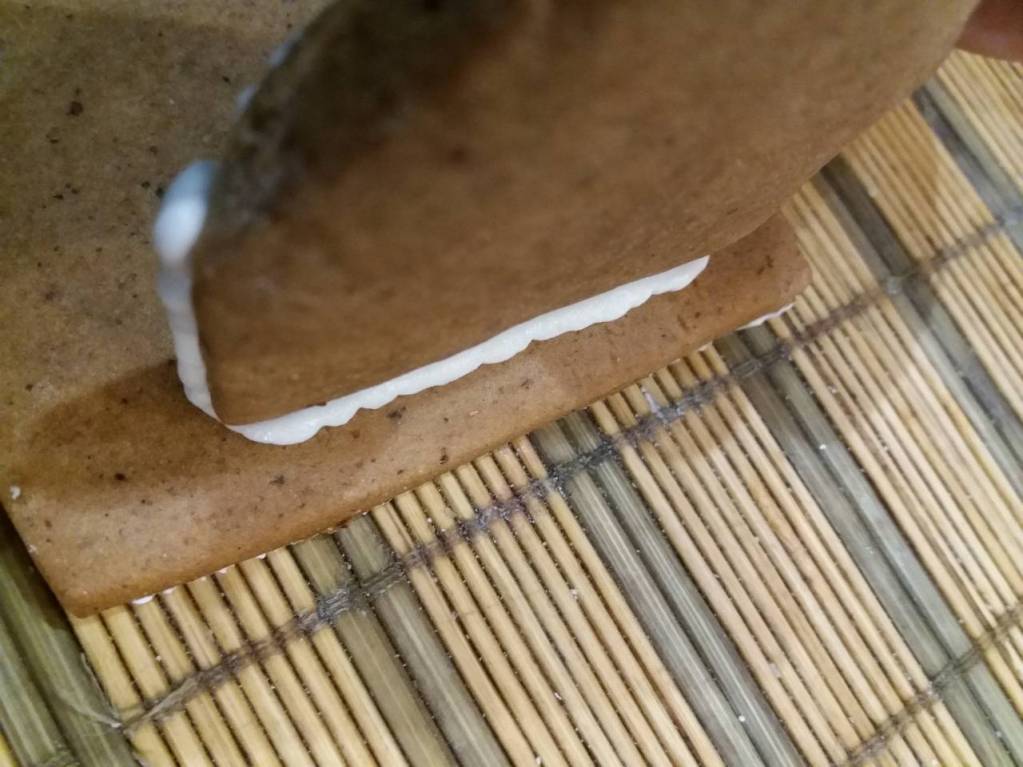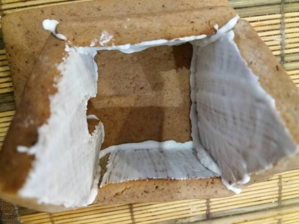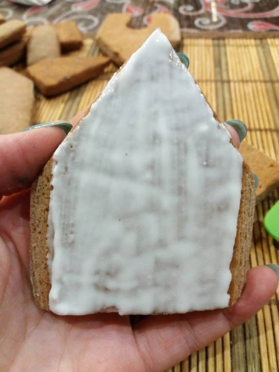 Надрезаем уголок на мешочке с айсингом и наносим его на заднюю стену (снизу и с правой стороны) и на одну боковую сторону (снизу и с боку) Приклеиваем на подложку, отступая от края около 1 см Из-за густого айсинга и небольшого размера домика все схватывается очень быстро, поэтому я сразу отпускаю руки (не держу, стенки не падают) и приклеиваю остальные стены домика