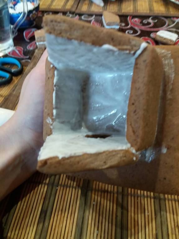 Если заглянуть внутрь, то видно, что айсинг некрасиво вылезает из швов Поэтому я беру кисточку, смачиваю ее водой (лишнюю жидкость вытираю об салфетку) и убираю все это Потом с помощью той же кисточки смазываю пол нашего домика Теперь смотрится все более менее аккуратно Подождите минут пять - десять, чтобы все хорошо схватилось