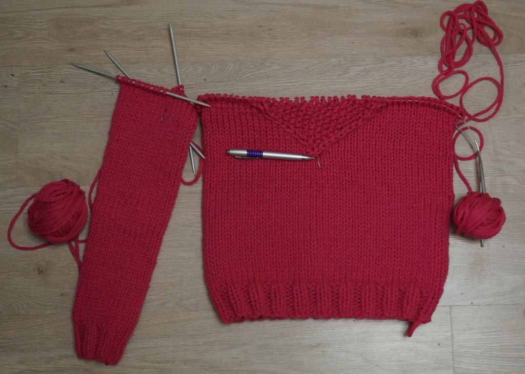 Довязан первый рукав, полностью связан второй, всё переведено на одни спицы, и скоро буду вывязывать горловину!