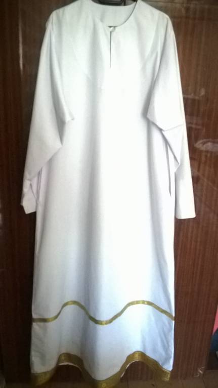 Вот и я дождалась, мне заказали подризник. Показываю, что получилось. Ткань супер. Белая сорочечная, гладенькая, скользкая, тонкая.Правда узкая - метровая, поэтому ушло 4,5 метра.