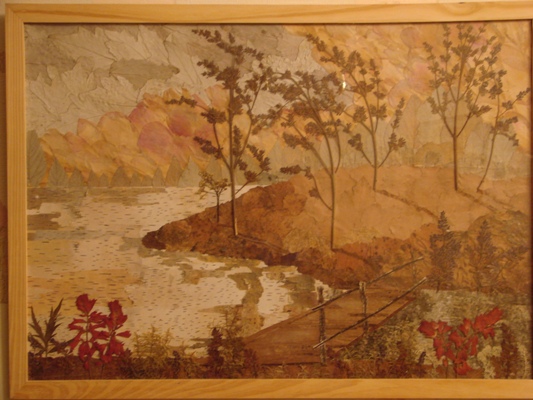 Сфотографировала картины. Делала в подарок моей маме одна умелица. Использовался природный материал (цветы, листья, травинки, кора деревьев, все высушивалось специальным образом)... и вот какая красота