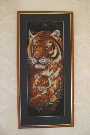 Кошачий колендарь начат почти 2 года назад, но так как я терпеть не могу шить шерстью, то берусь за работу крайне редко и шью крошечными частями. Натянута работа на напольный станок для вышивания - очень удобно для крупных работ.