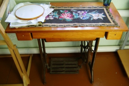 На швейной машинке лежит работа не моя, но примечательная - я ее нашла в заброшенном доме и ей как минимум лет 70 есть. А почти пустые пяльца - начатая только что метрика к рождению ребенка у моей подруги. Это будет рисунок кочалки-лошадки, на которой будет имя и дата рождения ребенка.