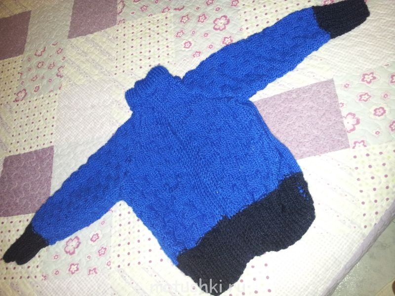 выкладываю фото,вот только модель моя,бегает шустро,не могу пока сфотографировать на нём(на малыше выглядит великовато,но на много лучше чем просто разложенное),но выбора нет,выкладываю без модели.Рукава несколько раз перевязывала(забыла что их расширять надо) у меня со всеми расширениями,довязыванием рукава, (перевязывания не считаю) и горловиной 4.968.