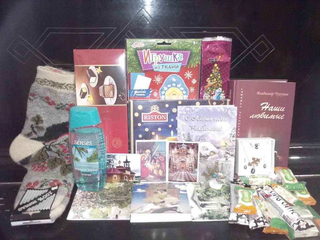 Как всегда, не угадала отправительницу, а это оказалась Оля-Пиама!!! Посылку сразу открыли! Перечисляю богатство: носочки со снегирями (удивительной красоты!), набор для изготовления игрушки из ткани, книга (такой у меня не было!), вкусный чай, томские конфеты типа "Птичье молоко" (очень люблю такие), россыпь конфет, магнитик с храмом (видимо, из села Оли), две иконочки из Иерусалима, блокнотики, украшения для девчонок и крестик (можжевеловый, Оля?). Сейчас еще попробую выложить фото. Вроде я всё перечислила...