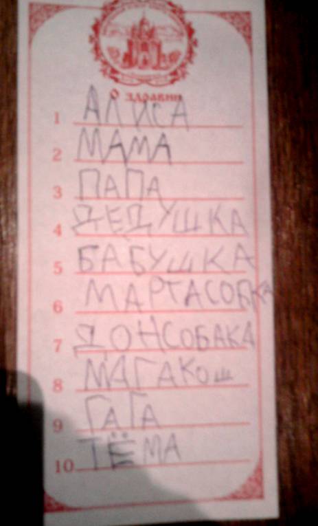 В воскресенье сестра (5 лет) приятеля сына писала в храме записку.