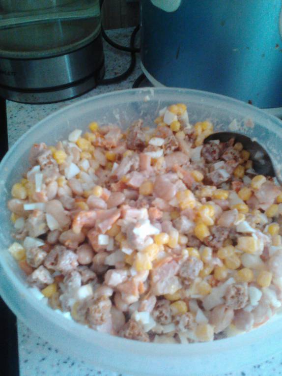 Полтавчанка, начиталась вчера вас и сделала сегодня салатик, с курочкой копченой, кукурузой, яйцами и фасолью с сухариками