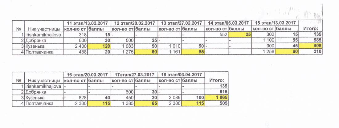 Девочки, я на этой неделе приведу все в порядок, отчитаюсь и сделаю таблицу. Следующий понедельник - последний отчет, надеюсь вы не против