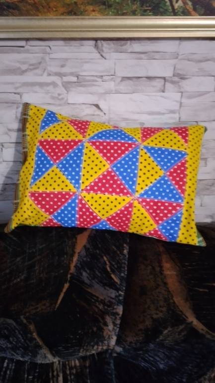Вот такая подушечка сшилась. Первый опыт в лоскутном шитье. Только нужно было треугольники расположить в другом порядке, чтобы присматривалась система. В следующий раз буду внимательнее.