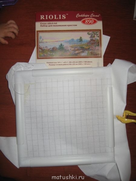 У меня 291 крестик. Начала с нуля новую вышивку, на этот раз пейзаж из закромов. Начала с белых ниток на белом фоне, поэтому кажется, что ничего нет. На самом деле - в верхнем левом углу процесс есть. Как видите, я решила поменять не только пяльца (кстати, очень удобные оказались, удобнее обысных круглых пластиковых с винтом), но и расчертила канву