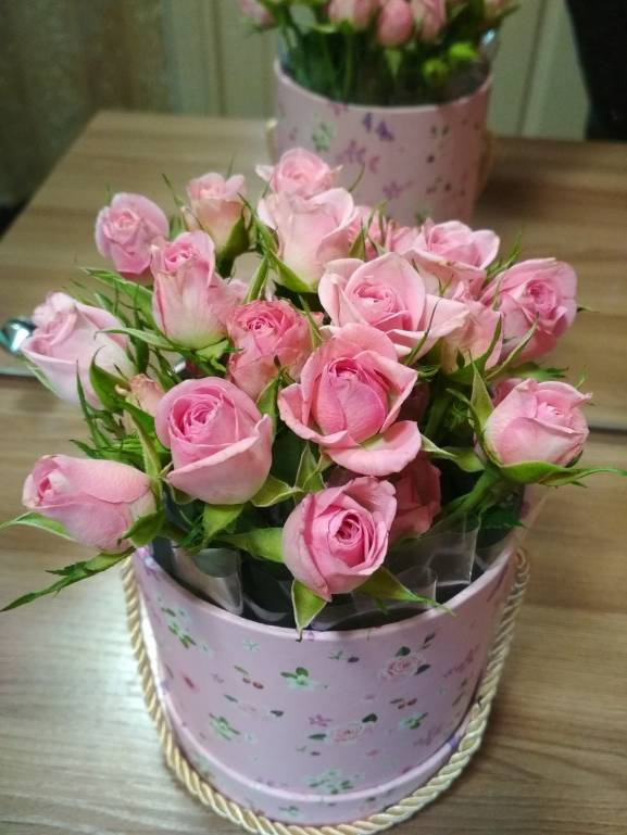 Сделала сестренке в подарок розы в коробке. Внизу сначала пленка упаковочная прозрачная, потом оазис с водой и вуаля.