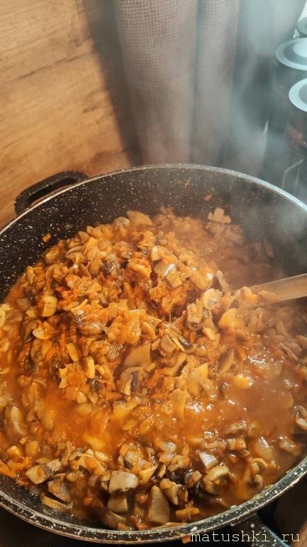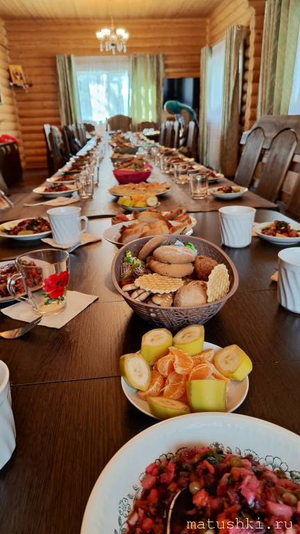 В трапезной сегодня готовили грибную подливу, гречку, винегрет, бутеброды с грибной икрой, плюшки сахарные с чаем.