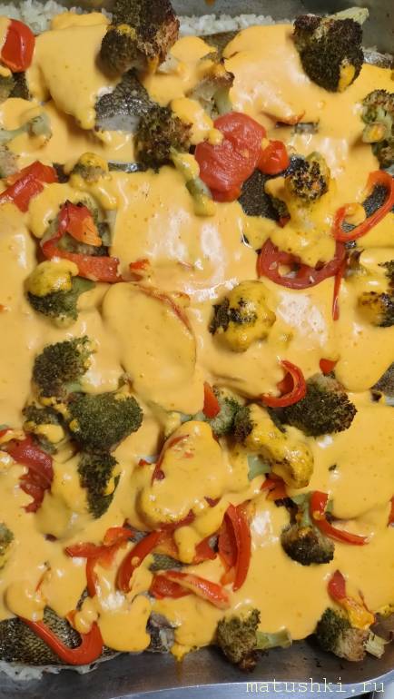 Решила сделать заливку из пары помидор,масло горчичное,чеснок и постный майонез,взбила блендером и за пять минут до окончания готовки залила этим соусом . Вкусненько)