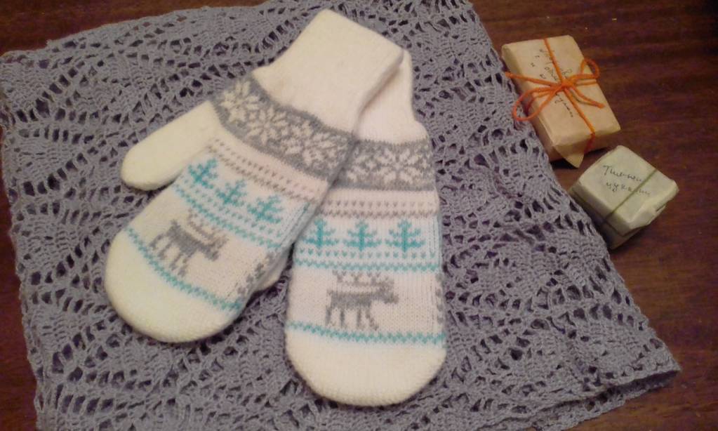 А в большом свёртке... Ой!!! Восторгам нет предела! Рукотворный (?) палантин лавандового цвета, очень теплый и красивый. Я его сразу на голову напялила. Завтра, при нормальном свете, сфотографируюсь в нём. Нежные варежки с оленем, которые мне впору, спасибо!