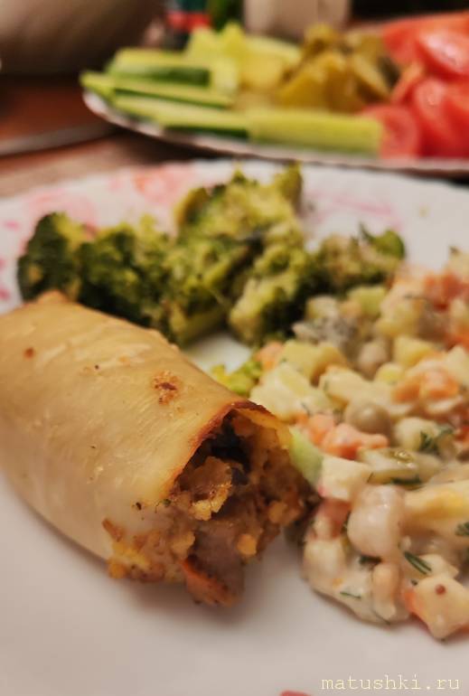 -Кальмары фаршированные (обжареные лук, морковь, грибы, еще у меня пшено);