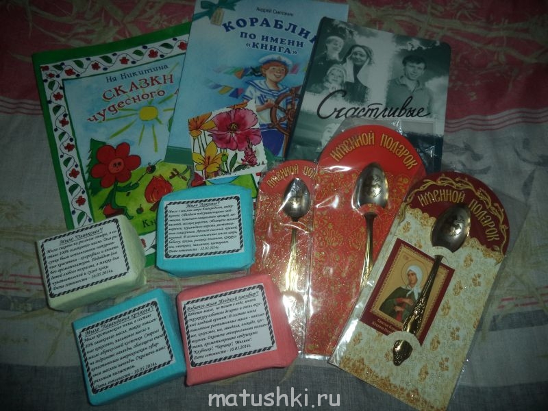Фея Сирень, ой, ну я рада, что наконец-то все дошло и все понравилось! Книжки издательства нашего Свято-Елизаветинского монастыря в Минске, ложечки тоже их производства, мыло, понятно, моего производства. Так что все наше, белорусское. С ложками все просто, их действительно нужно использовать по назначению и пользоваться также, как и обычными ложками. Просто с такими красивыми и именными наверное и трапеза вкуснее будет (для себя мы правда еще не приобрели, а вот в подарок часто покупаю). Спасибо, что так быстро смогли забрать посылку, чтоб я не мучилась в нетерпении!