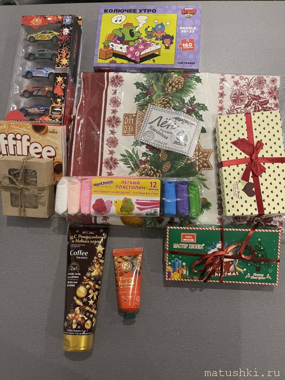 Попредметно: новогодняя скатерть! Это прекрасно, мне как раз нужна была новая! Две загадочные коробочки, в которых обнаружились две пары нарядных новогодних носочков и две шоколадки «Mercy» (мои любимые!) и очаровательный ангелочек на ёлку. Машинки, которые я планирую положить под ёлку Павлику:), воздушный пластилин для Ника, паззл на тему компьютерной игры для него же. Очень тщательно учтены все пожелания анкеты! Слева, по всей вероятности, мыло ручной работы, эту коробочку я ещё не открывала:). Гель для душа и крем для рук, опять же, в полным соответствием с заявленными любимыми ароматами