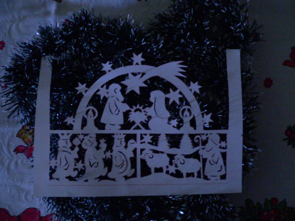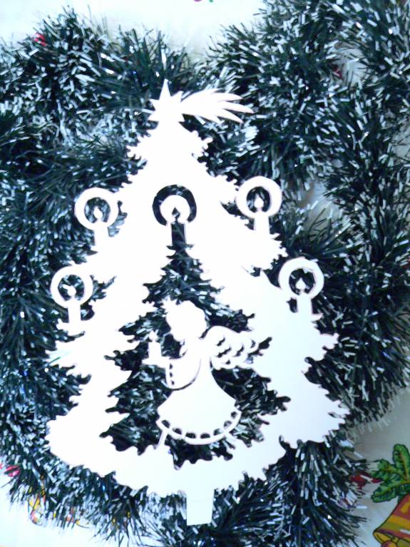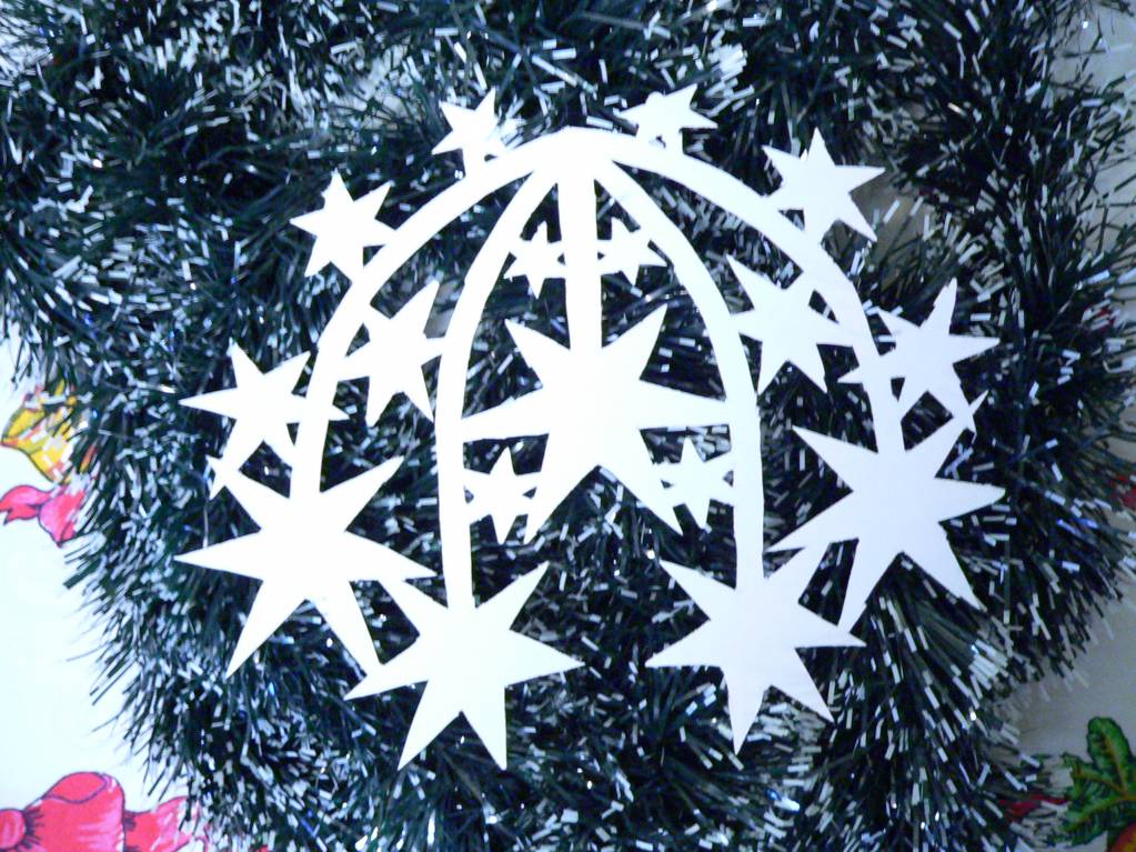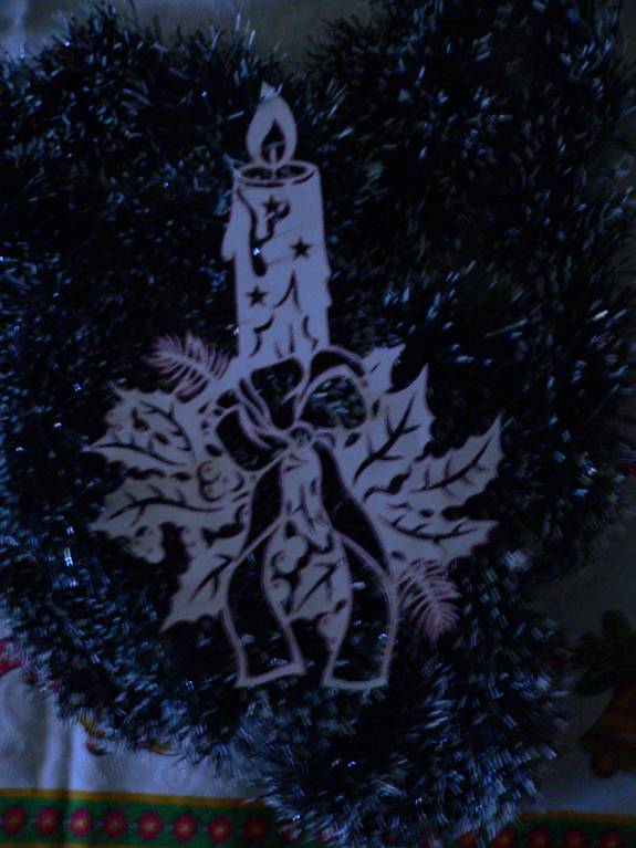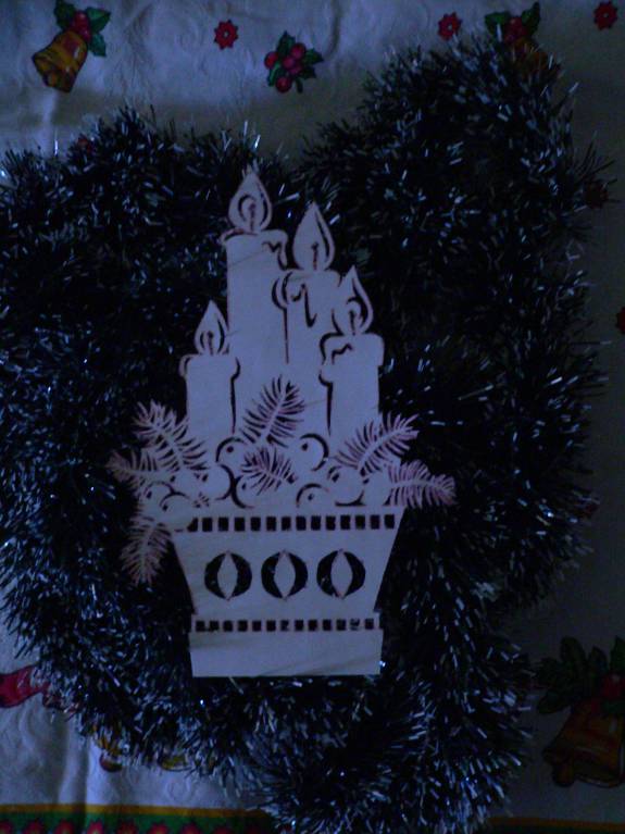 Я уже убираю праздничные декорации, но спохватилась и сфотографировала свои вытынанки, правда не на окошке, но всё же они хорошо видны.