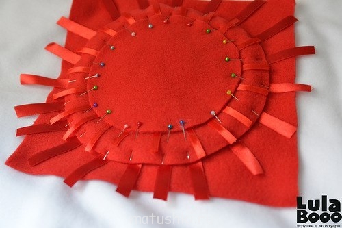 Вырезаем 2 круга разного диаметра, ленточки для лучиков. Скрепляем. Пришиваем.