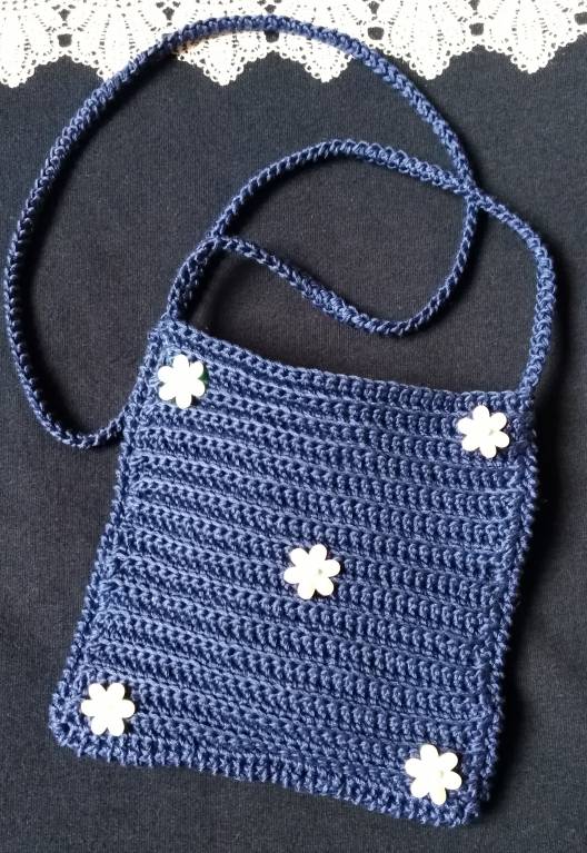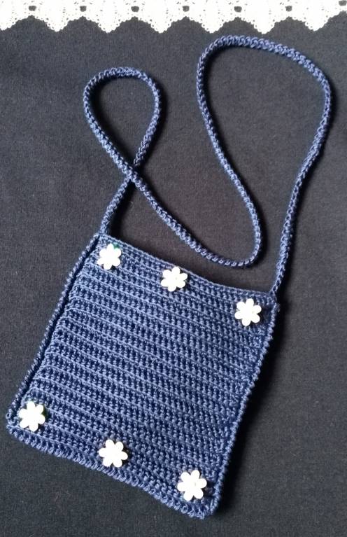 Пока Лиса прибаливала на выходных, быстренько связала ей кармашек для носового платочка к школьному платью. Дома нашелся синий хлопок и немного пайеток, сегодня оценит в действии.