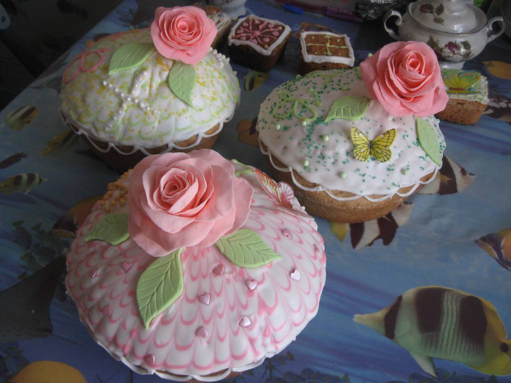 А еще я накупила всяких украшалочек и просмотрела несколько мастер классов по лепке сахарных цветов, поэтому красиво, насколько могла, украсила несколько куличей на подарок. Дети тоже участвовали, им очень понравилось рисовать глазурью, выдавливая ее из кондитерских мешков. Вот, что у нас в итоге получилось. Отправлено спустя 3 минуты 8 секунд: