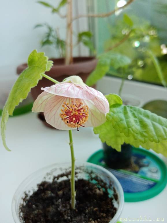 У меня зацвела интересные цветы дома, абутилон Джульетта. Они ещё маленькие. Выростила их из семян. Как на зло семена взошли 100%. Теперь у меня таких цветов больше 10. Куда мне столько. Начала потихоньку раздавать.