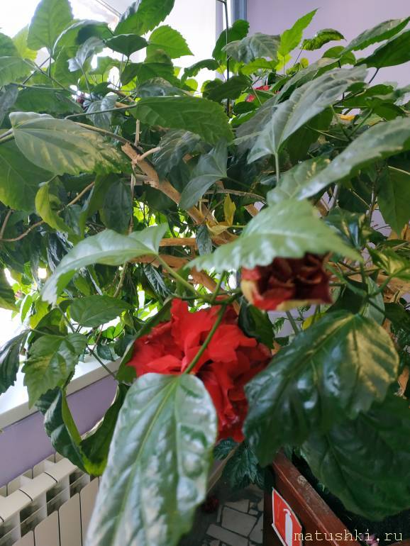 В коридоре стоит большущий, прямо огромный гибискус, настоящее дерево. Много крупных цветов, листья тоже большие глянцевые. В кашпо земли не видно, весь верхний слой состоит из чайной заварки, видимо это удобрение так его радует