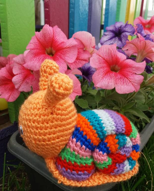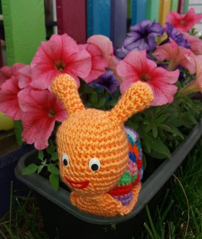 Внучке понравился мультик про улиточку. А у меня клубочков маленьких насобиралось...получилась Уля.