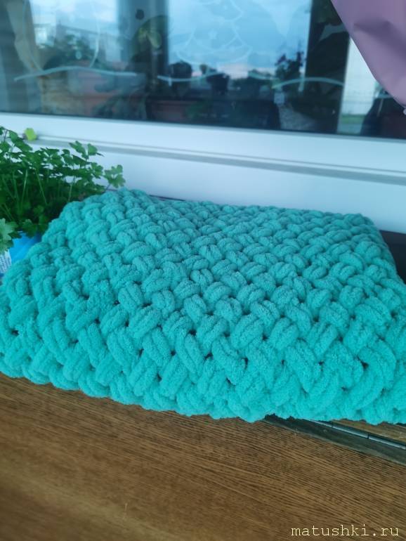 Это пряжа с готовыми петельками, которую можно руками вязать, без спиц? Сколько мотков ушло?
