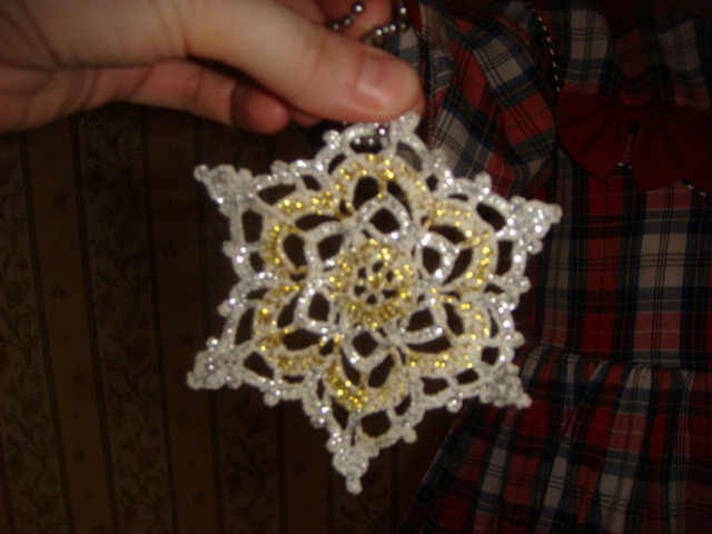 Вязала такие снежинки два года назад. Нитки х/б, накрахмалила, потом покрыла блестящим гелем. Фото не очень.,на ёлке смотрится хорошо, блестят, перелеваются.