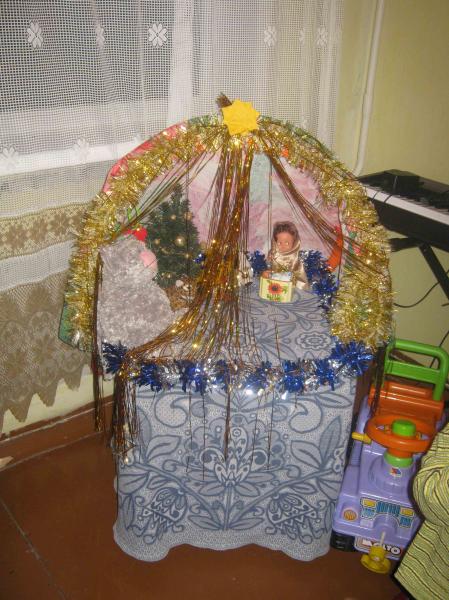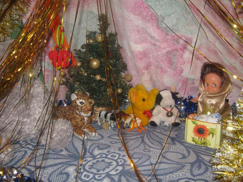 Решила для деток сделать вертеп. Поставили маленькую елочку. Одела одну куклу как Божию Матерь, сделали ясли, туда тоже положила маленькую куколку. Поставили животных - ведь все пришли посмотреть на новорожденного Христа! Смущает немного только, что кукол поставила, но иначе не знаю как лучше сделать.