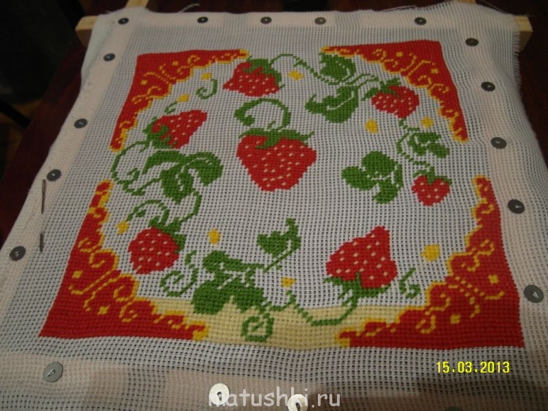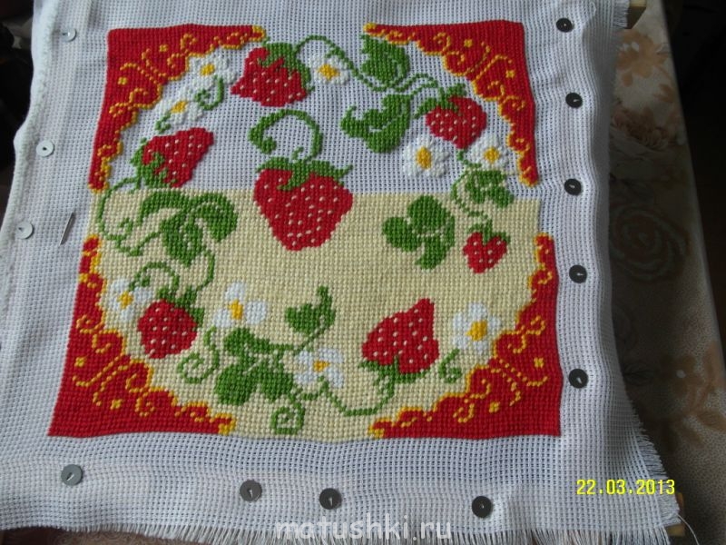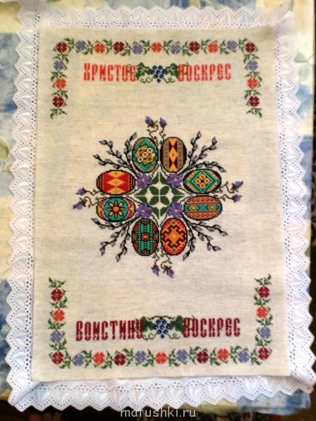 Примеряю отделку на готовую вышивку. Пока не определилась, обвязать края, или пришить оборочку.
