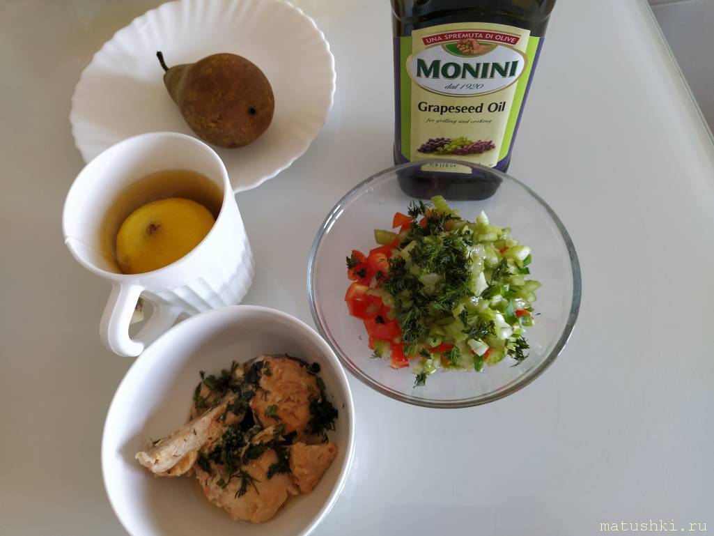 Рыба + салат из огурцов с маслом росторопши, отвар из сушеного барбариса