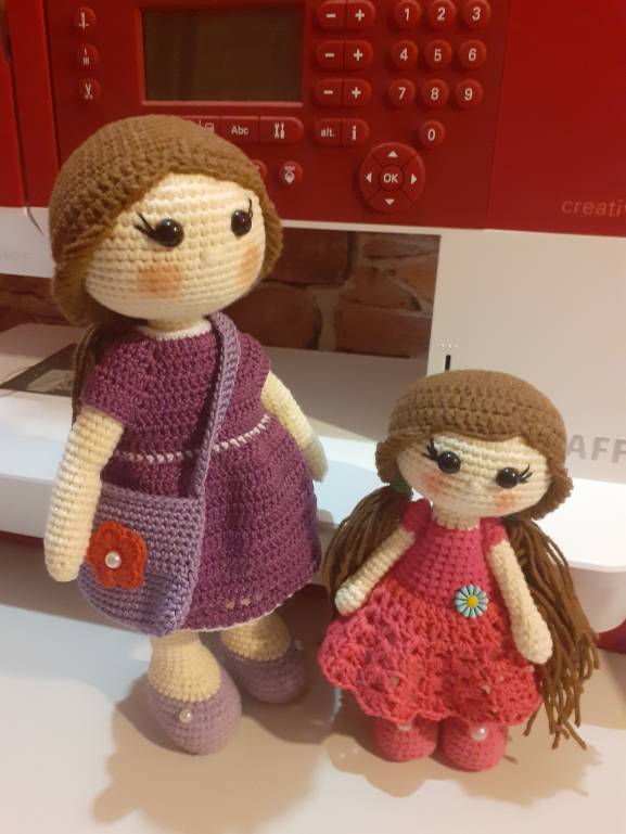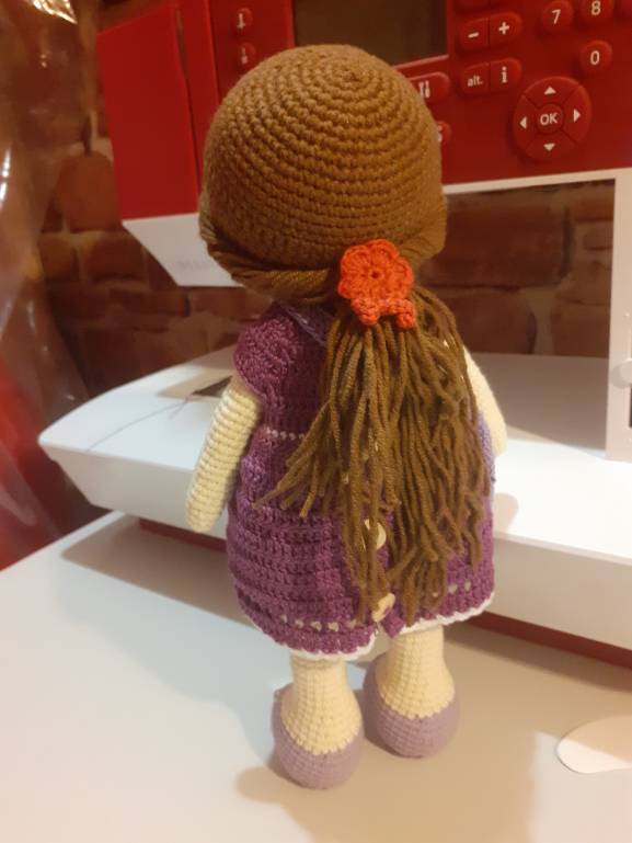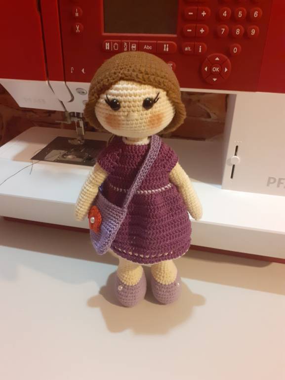 , ту что в сиреневом. Маленькую переодевать нельзя, а вот та что побольше можно менять наряды. Хотя сначала вязала и задумка была немного другая. А по ходу решила, что она модница и нарядов должна иметь много))