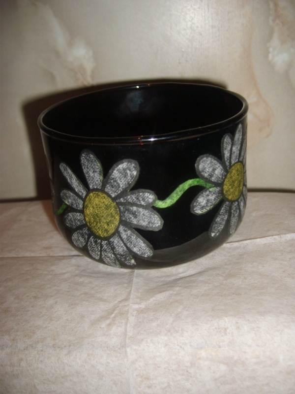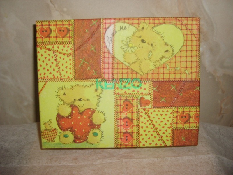 Фон желтая акриловая краска, под ней белая акриловая краска. Сверху - вырезки из салфеток,тени - зеленый акрил. Сверху лак.