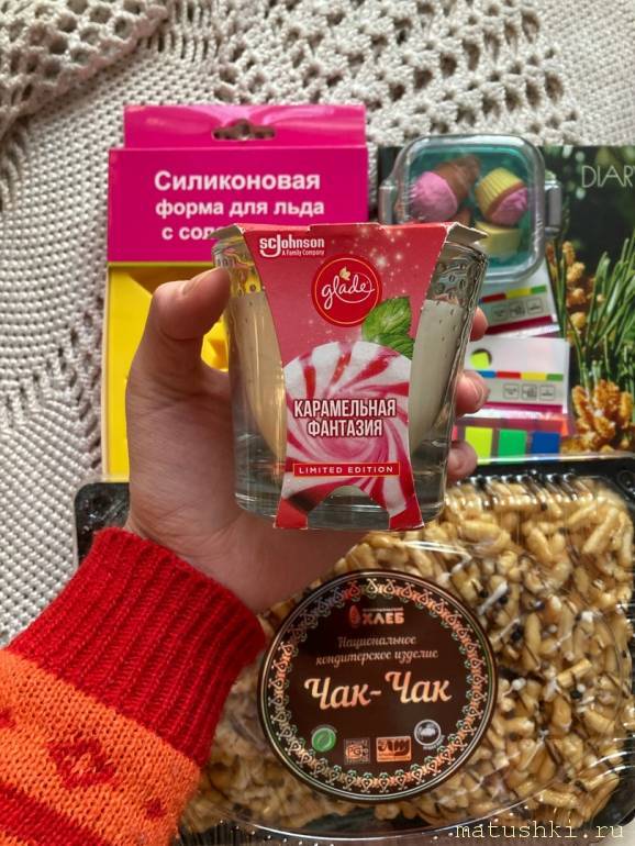 Блокнот, закладки-стикеры (у меня как раз кончились), ластики-нямки, форма для льда (я недавно сломала эту простую пластиковую случайно), вкуснейше пахнущая свечка и чак-чаааак