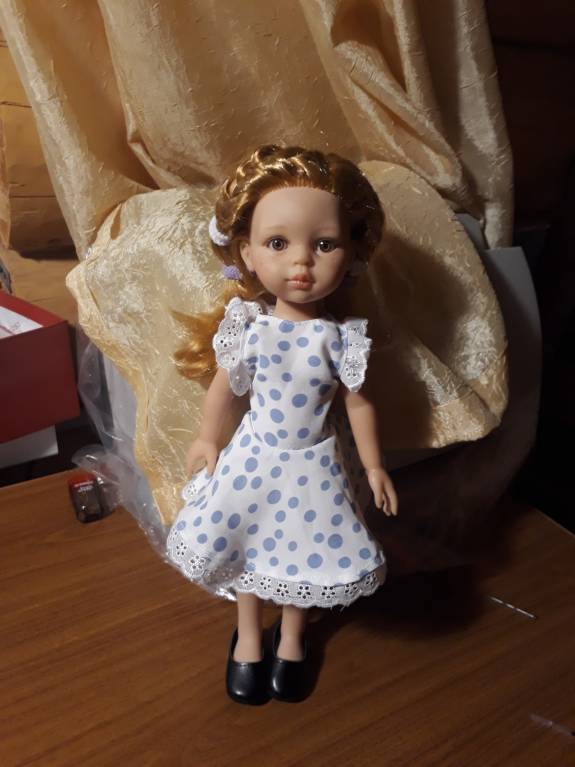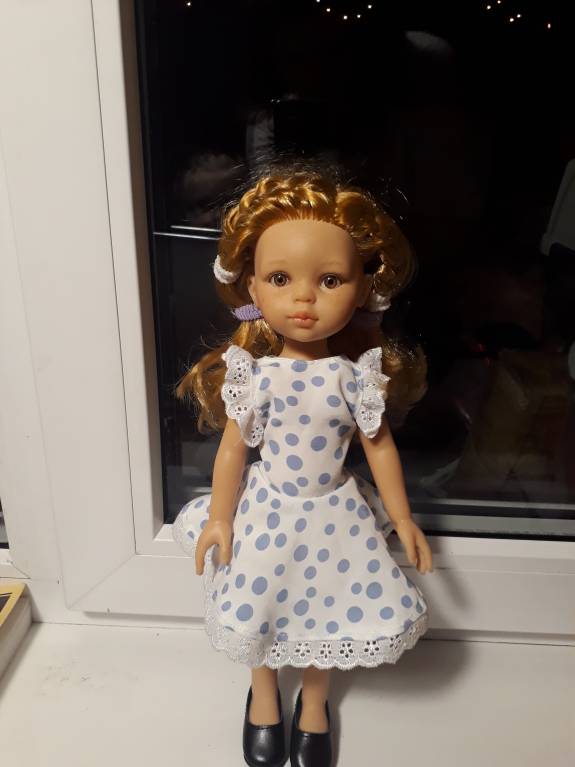 Мой первый опыт шитья одежды куклам,низ полностью (платье белое в голубой горох)я сшила,крылышки у рукава переделывала раз 5