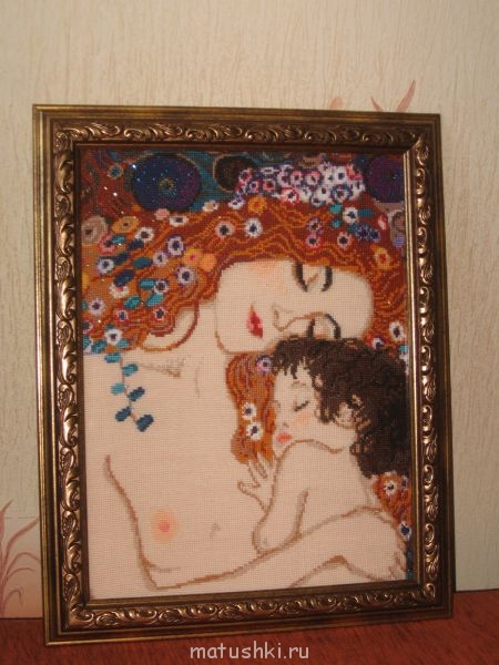 Кроме того, убедилась, что вышивать квадратиками мне нельзя, крестики на стыке двух квадратиков несколько отличаются, заметен стык на однотонном полотне. А ещё выкладываю оформленную "Женщину с ребенком" Климта, во всей красе, так сказать.