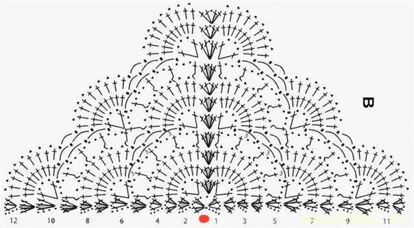 2 ряд: переворачиваешь вязание. На схеме второй и четные ряды вяжутся как бы слева направо, но в реале все ряды вяжутся справа налево. Для этого после каждого ряда полотно нужно перевернуть! 4 вп подъема (это вместо первого ст с накидом, 1 ст с накидом в вп предыдущего ряда, 1 вп, 2 ст с накидом в ту же вп. Следующий ст с накидом делаешь уже в вп, которая первая среди 3 вп в центре, 3 вп, снова столбик с накидом в ту же петлю. Следующие 2 столбика - в центральную вп, 1 вп, 2 столбика в ту же центральную петлю. 1 столбик в третью вп, 3 вп, столбик в ту же петлю. 2 столбика в вп между 2 столбиками предыдущего ряда, 1 вп, и последние 2 столбика в ту же петлю. Снова переворачиваешь вязание и начинаешь 3 ряд
