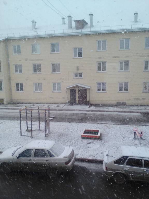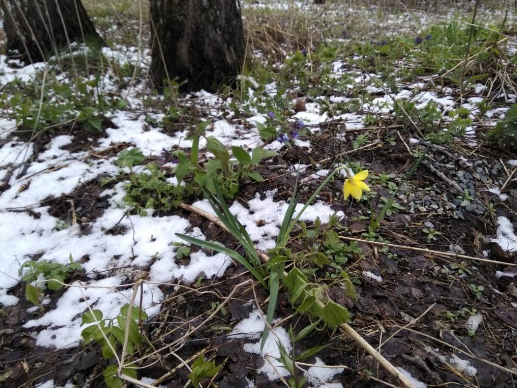 снежок лег. На деревьях листьев почти нет, довольно холодный май. сегодня шествие в честь празднования Кириллу и Мефодию отменили из-за погодных условий. Холодно и сыро.