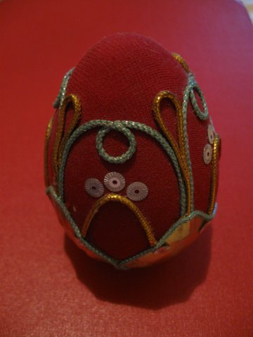 мне на Рождество девочки из воскресной школы подарили подобное бисерное яичко - такая милая вещь, гладенькая, приятная на ощупь. я его, недолго думая, решила применить в качестве украшения - повесила на лысый фикус, чтоб объем кроне создавало..
