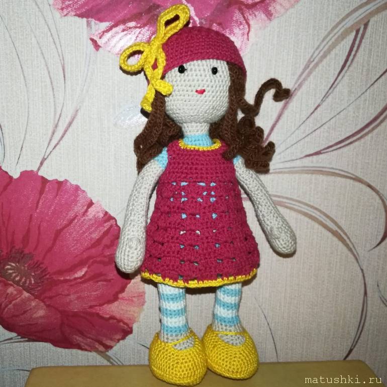 Пару лет назад начала вязать куклу. Она мне понравилась, я нашла ее описание (если бы знала, что описание соответствует реальности весьма относительно, по крайней мере то, которое мне попалось, то не бралась бы), связала туловище, голову и волосы. Платье по описанию не получилось совсем, а потом случился наш переезд в Калугу, ну, а кукла осталась ждать меня в Беларуси. И тут на днях попалась на глаза. К тому же у меня появилось время на то, чтобы отыскать в Интернете вменяемое описание платья и придумать, как связать шапочку и башмачки. В итоге она наконец-то стала полноценной куколкой