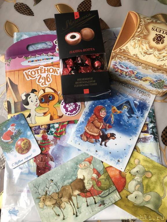 Ура!я дошла до почты и получила открыточку и прилагающуюся к ней посылочку!Моя Снегурочка Юля -Волна прислала мне красивую открыточку с тёплыми тёплыми пожеланиями.Ещё две открыточки с очаровательными озорными дел морозом ,оленями и мышками .Старшая дочь в восторге.Раскраска с котиками (котёнок гав)-Кузьма заценил ,Конфетки вкуснейшие и чай в сундучке .
